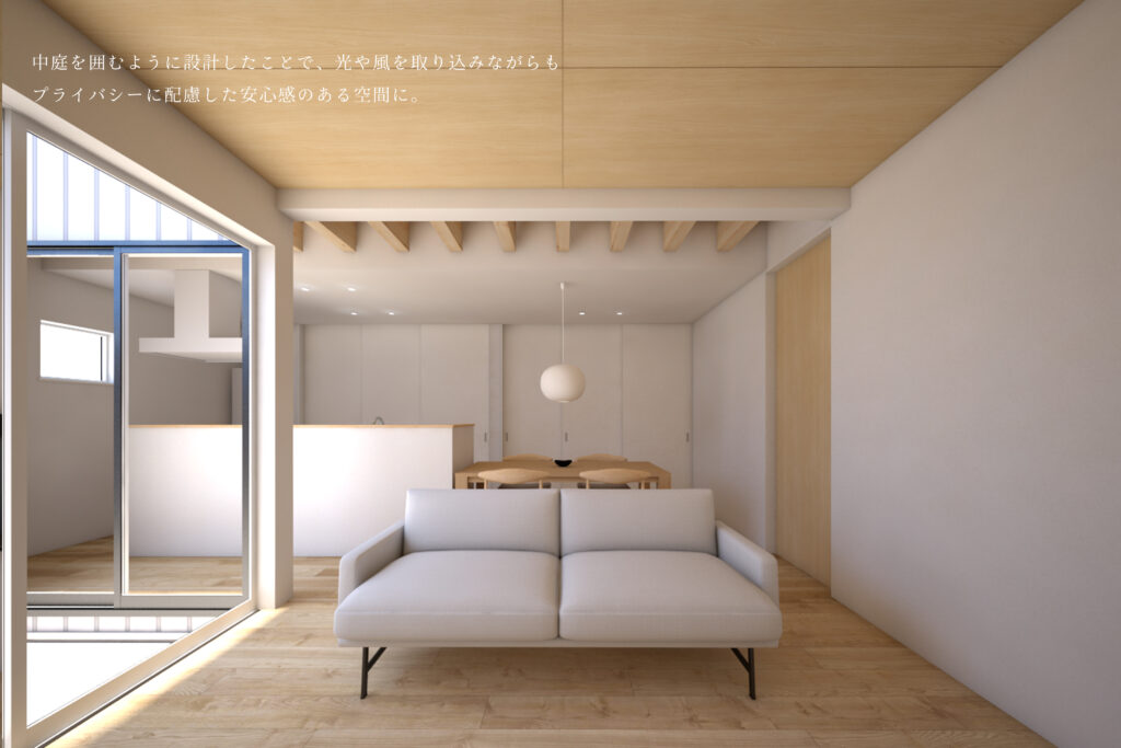 中庭を囲むように設計したことで、光や風を取り込みながらも