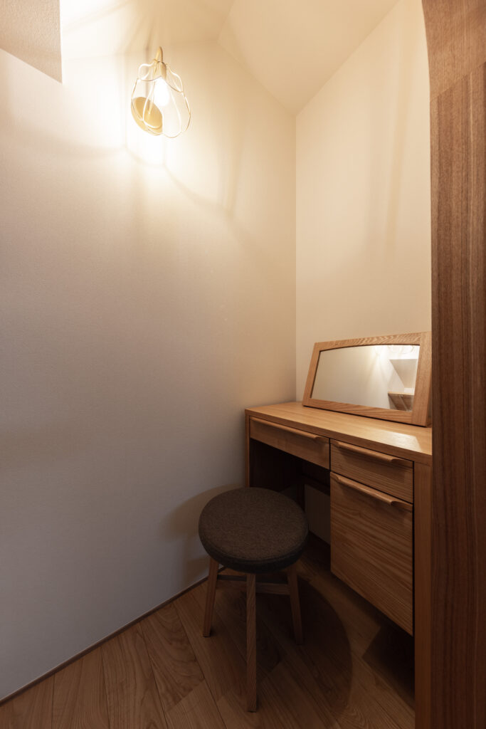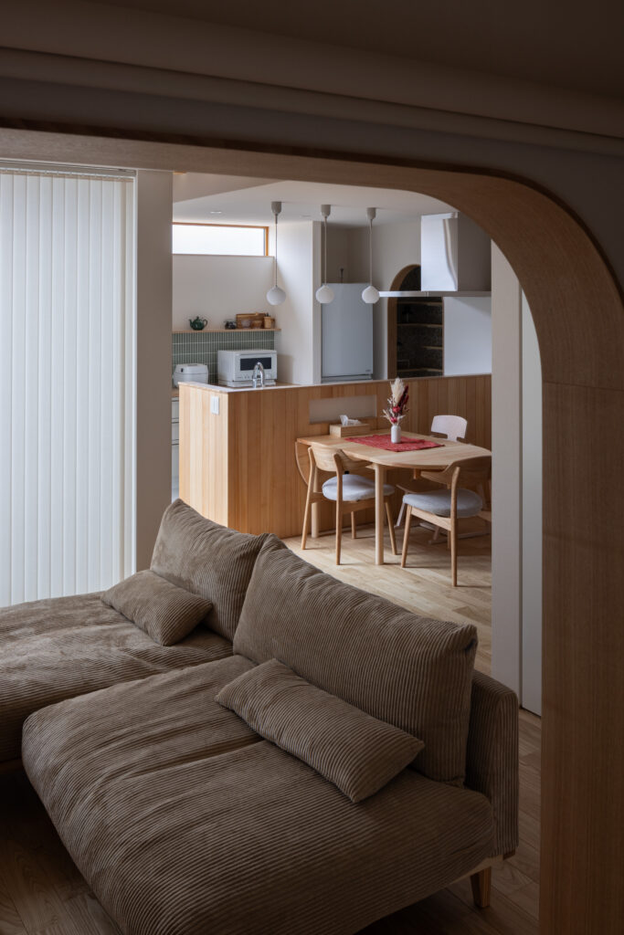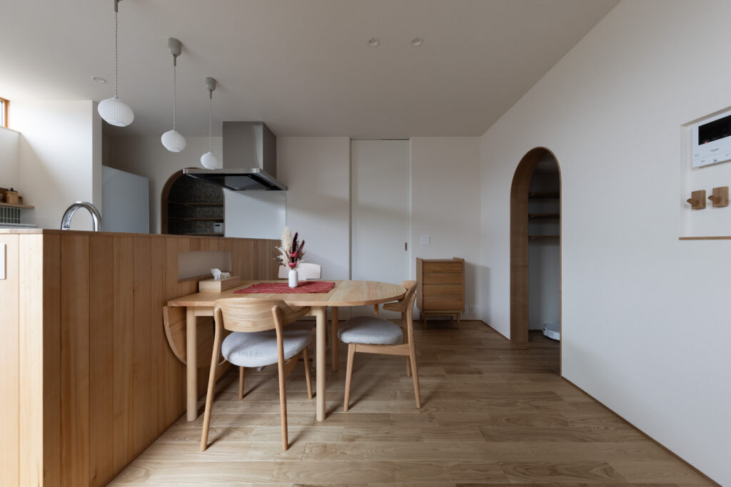無垢の床や造作棚、アーチの木枠など、手ざわりのある素材を大切に。