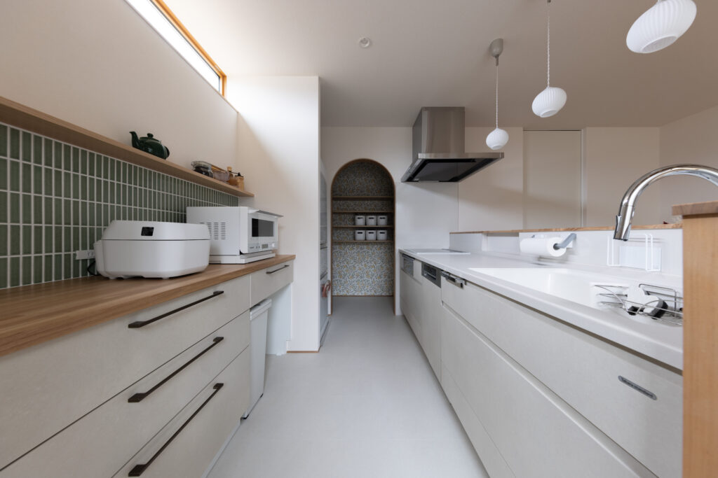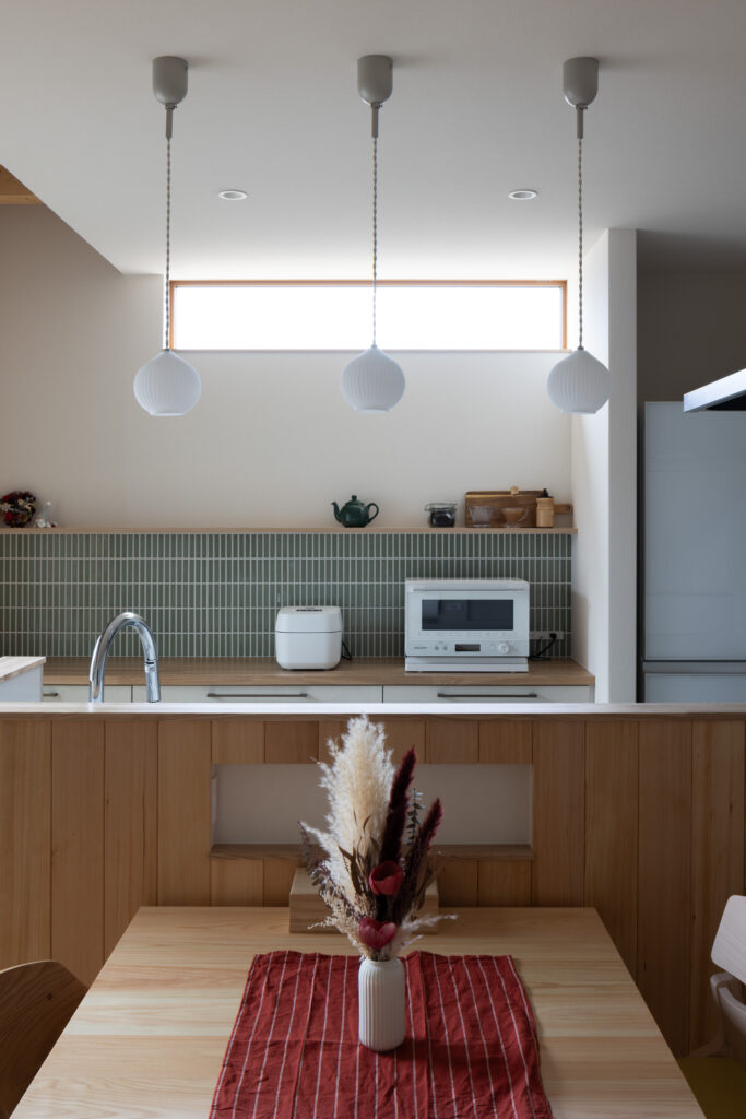 キッチンの背面にはグリーンのタイルをあしらい、